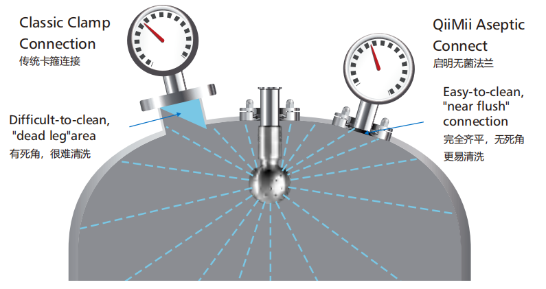 QiiMii Aseptic Connectors can connect a wide range of equipment with Tc connections but can also be equipped with a blind capwithout affecting the aseptic qualities of the system. in addition to being prepared for unforeseen needs, many of our customerschoose to weld in extra Aseptic Connectors and equip the superfluous ones with blind caps. The cost and time saved whenremoving a blind cap and connecting new equipment, compared to cutting up the tank and welding in new connections, isenormous.