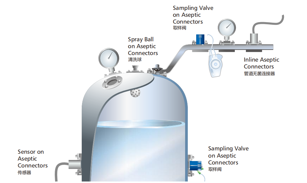 OiiMlii Aseptic Connectors are available in a tank connected version and also as an in-ine solution. The increasing demand fortraceability and control during a process makes Aseptic Connectors when used together with sampling system the ultimatesolution for total process monitoring control.
