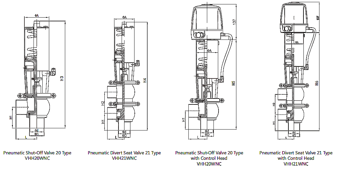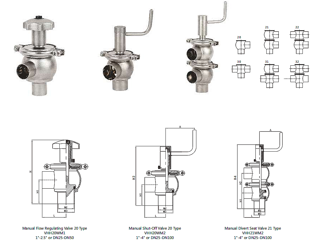 Material: Other Steel Parts: SS304 Seat Seal: EPDM, FKM per FDA 177.2600 Connection:Clamp End/eld End/Male End Body type: 20,21,30,31,22,32 |