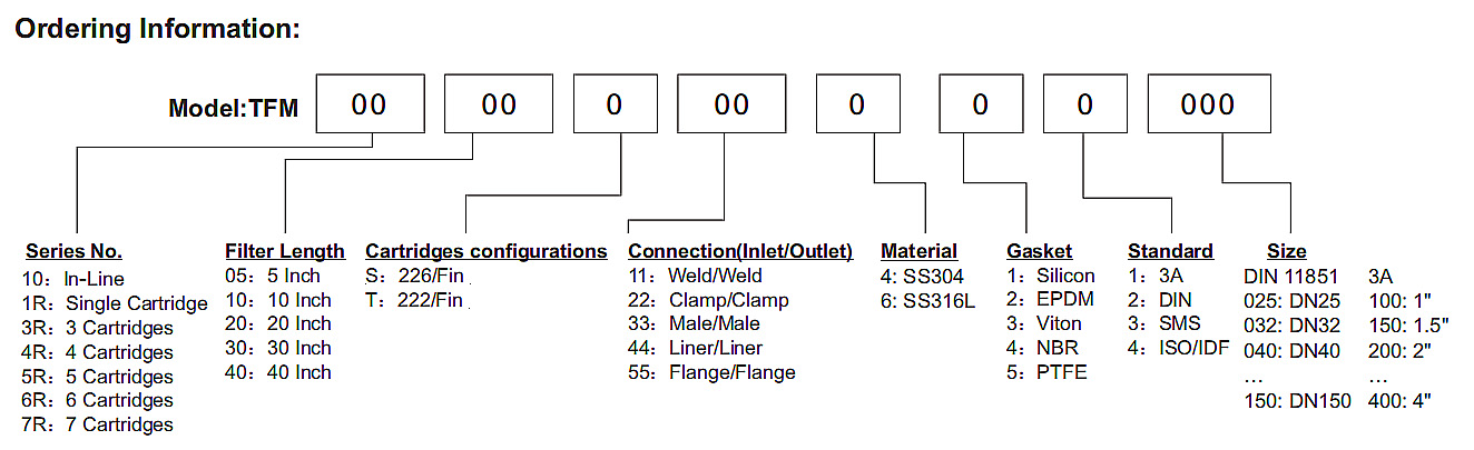 | TFM1R10S22411150 | 1 | 10" | 226 | 101.6 | 625 | 170 | 220 | Clamp | 1.5" | |
