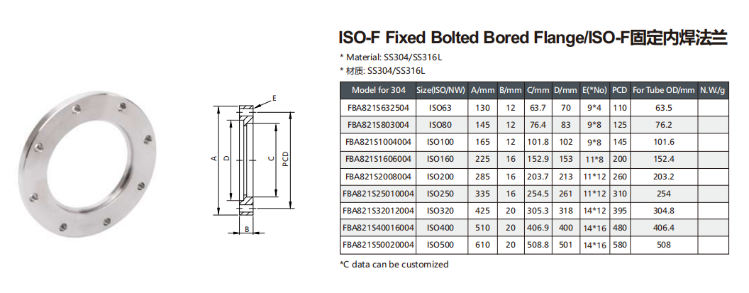 Model for 304 | Size(ISO/NW) | A/mm | B/mm | C/mm | D/mm | E(*No) | PCD | For Tube OD/mm |