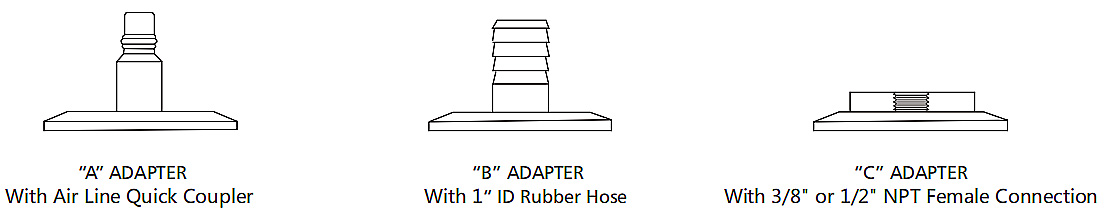 ·Choice of Quick Coupler, 1" Hose Barb, or 3 /8", 1/2" Female NPT air line adapters.