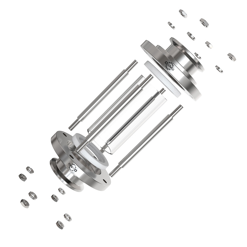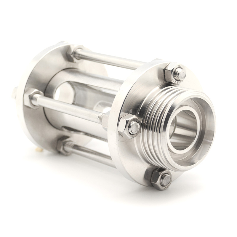 InquireTSI01 In-Line sight glass consists of a glass tube compressed between two flanges, with a double nut tensioning to prevent over-tightening of the glass. Option to include an stainless-steel grid around the tube as a safety precaution, and the standard sanitary connection of a Tri-Clamp. It is ideal for efficient viewing while supervising your active process.